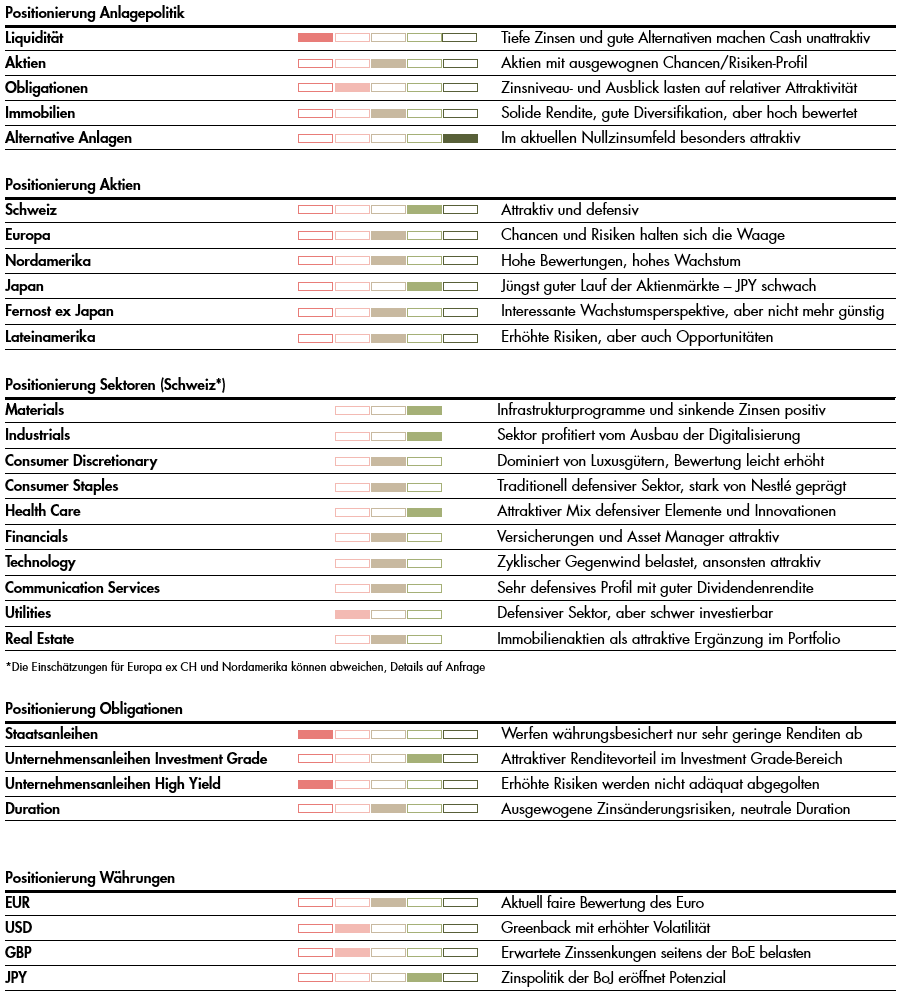 Die Einschätzungen zu den Assetklassen und Sektoren sind wie folgt zu lesen: